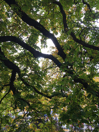 Jag kunde ana solen bakom lövverken vid träden längs ån.