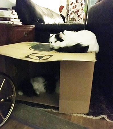 Lådan börjar bli medfaren, men fungerade som våningssäng igår kväl. Citrus ovanpå, Lucifer inuti.
