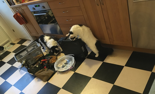 Lucifer och Citrus nyfikna på elektrikerns grejor