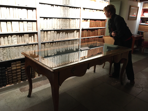 Linnés skrivbord och E som tittar på gamla avhandlingar.