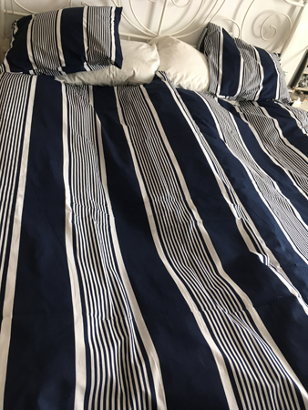 Renbäddat med nya mörkblåvitrandiga påslakan