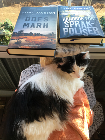 Lucifer med böckerna Ödesmark och Handbok för språkpoliser