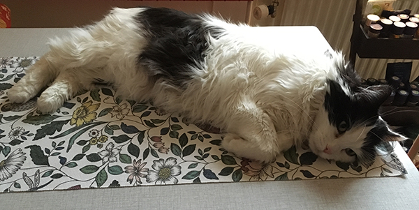 Lucifer utsträckt på köksbordet