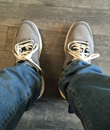 Mina fötter och jeansben i väntrummet