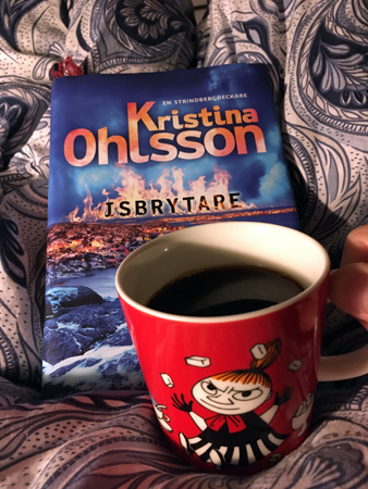 Boken Isbrytare o kaffe i Lilla Mymugg på sängen
