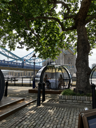 På vägen hem från Towern låg dessa restaurangglasbubblor vid Themsen. Minst 4 000 spänn var en tvungen att äta för om en skulle boka en bubbla…