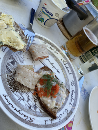 Gubbröra på bröd och rulllar med rökt lax gjorda av Slottsfrun.