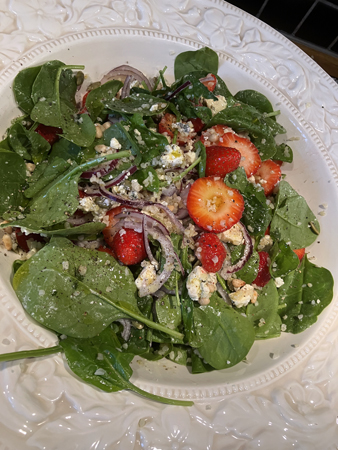 Bulgursallad med jordgubbar ädelost rödlök spenat o pinjenötter