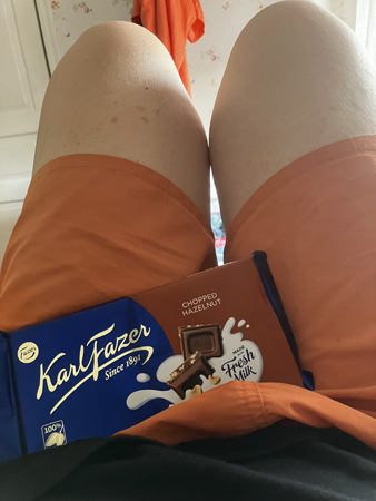 Chokladbruna ben har jag bestämt inte och chokladen har jag inte öppnat.