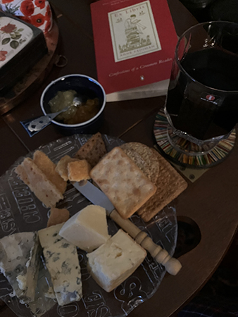 Ostassiett ett glas rött och boken Ex Libris