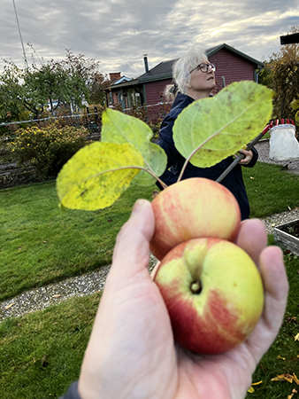 Nya slottsfrun spanar och jag håller två nyplockade äpplen.