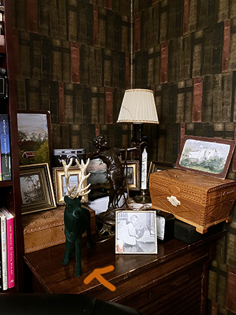 En grön ren med glittriga horn tronar ovanpå farfars och morfars arkivskåp.