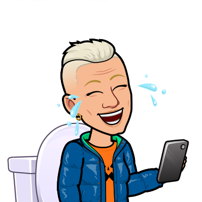 Bitmoji Tofflan sitter på toa o skrattar åt nåt på mobilen