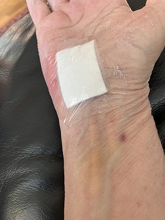 Lite gul och blå på handleden.