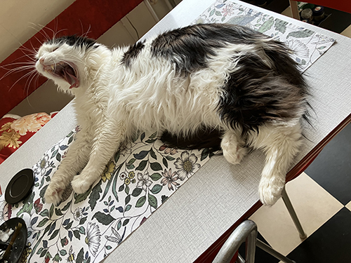 Lucifer gäspar på köksbordet
