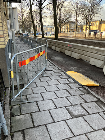 Avspärrat på trottoaren nedanför huset mot järnvägen