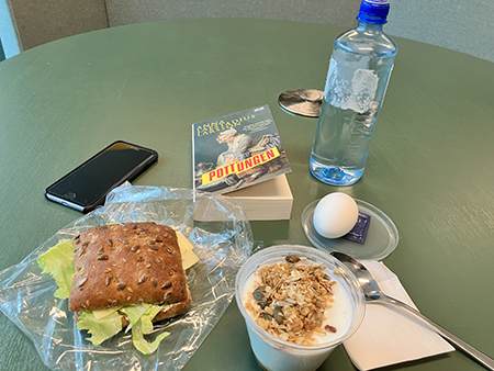Jobblunch med macka yoghurt ägg vatten och boken Pottungen