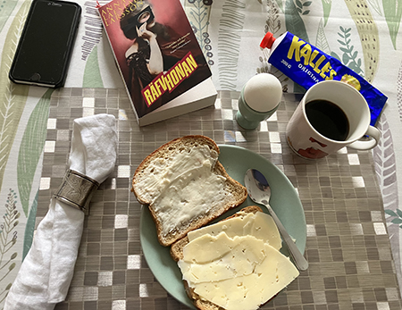 Hemmalunch med mackor kokt ägg en halv mugg kaffe o boken Räfvhonan