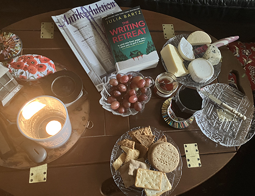Fredagsmiddag ost kex druvor vin boken The writing retreat o Antiktidningen