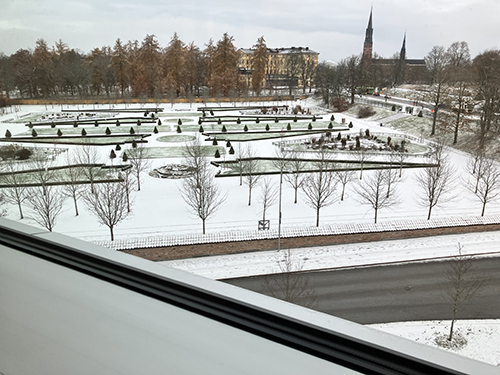 Utsikt från jobbfönstret barockträdgården Domkyrkan vinter
