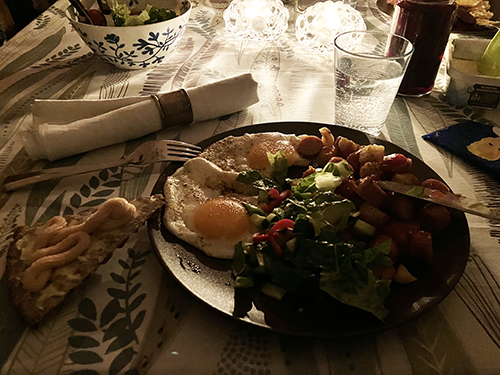 Stekt potatis kycklingkorv o ägg grönsaker