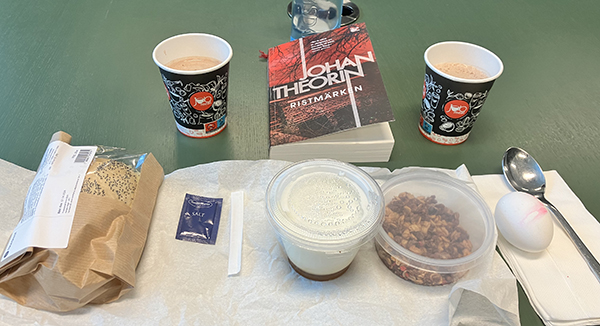 Jobblunch med macka ägg salt yoghurt müsli och boken Ristmärken