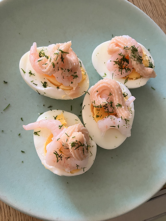 Ägghalvor med räkor Kalles kaviar o frusen dill