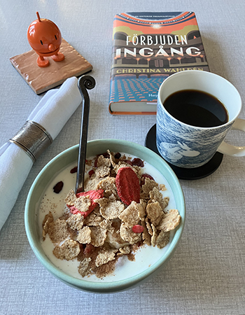 Frukostfil med nyttigheter Hopptimisten kaffe o boken Förbjuden ingång