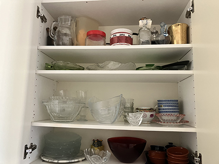 I tredje överskåpet har jag kannor, burkar, mortlar, skålar, sillfat, assietter och ostbrickan.