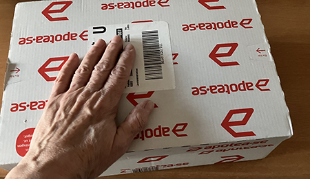 En låda från Apotea med min hand på