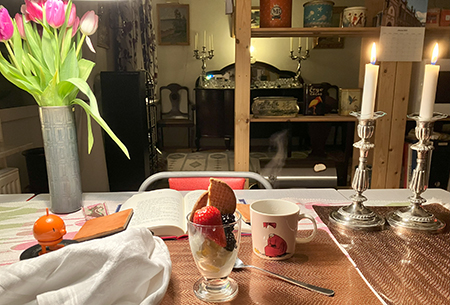 Glass med bär kaffe bokuppslag Hopptiminsten tända ljus tulpaner