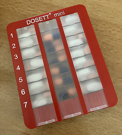 Knökfylld dosett med mediciner för en vecka