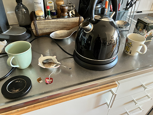 Muggar vattenkokare och tepåse på diskbänken