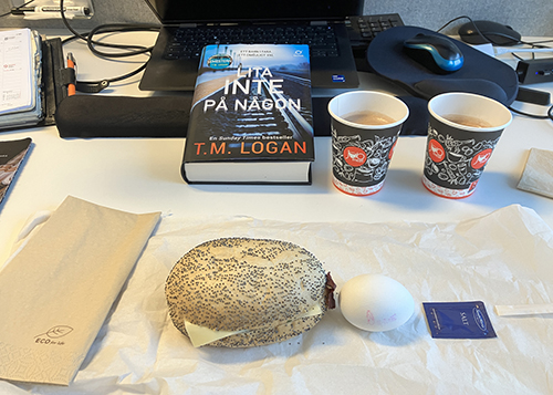 Skrivbordslunch med varm choklad boken Lita inte på någon macka o ägg
