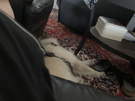 Baldur på vardagsrumsgolvet nedanför soffan o ena fåtöljen