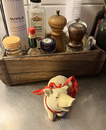 Köksgrisen med rött sidenband om halsen
