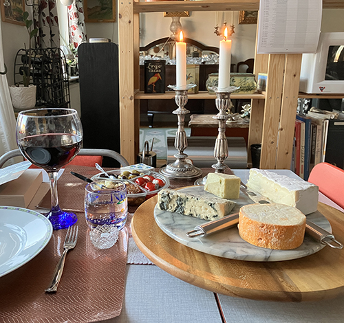 …och sen ostbrickan med plockmaten bakom. Och levande ljus, för det började skymma.