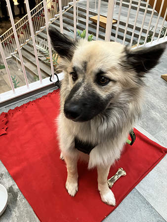 Baldur lägger huvudet på sned o tittar på vänstra ficka