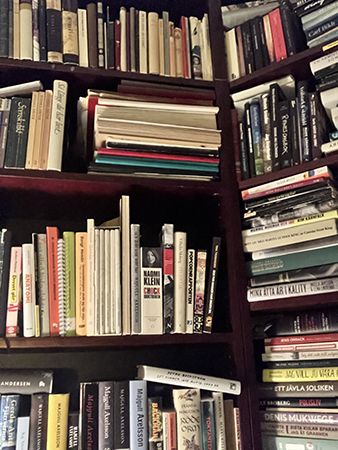 Böcker till höger om sängen och farfarsfåtöljen med lakan i Bokrummet