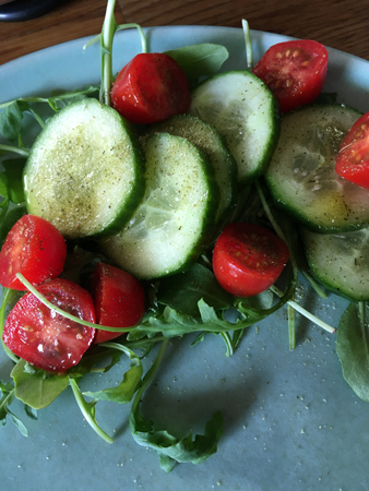 Snabbsallad dvs färska grönsaker med olivolja och italiensk salladskrydda.