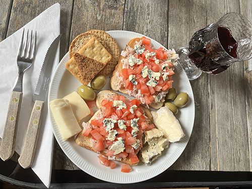 Finske Pinnens bruschetta kex ost och GWs röda i glaset