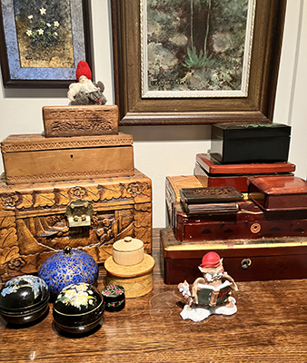 Garntomte och läsande tomteuggla på arkivskåpet i hallen