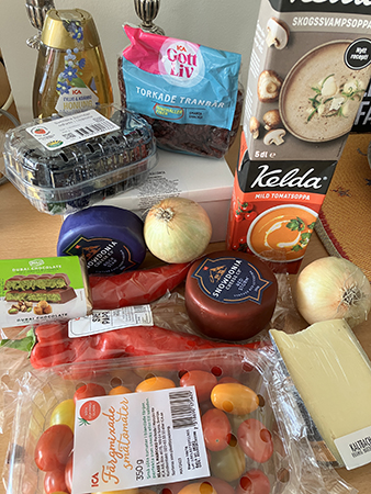 Honung bär kartong med smörgåstårta soppor ostar lök tomater spetspaprika choklad från Dubai