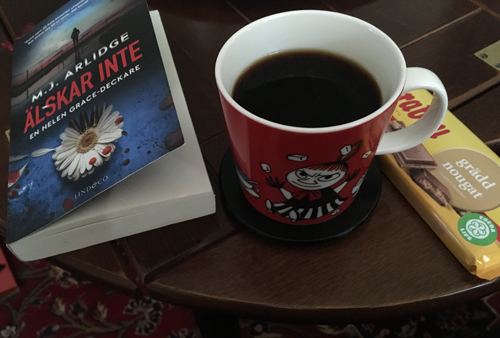 Kvällsfika med boken Älskar inte lilla Mymugg och choklad