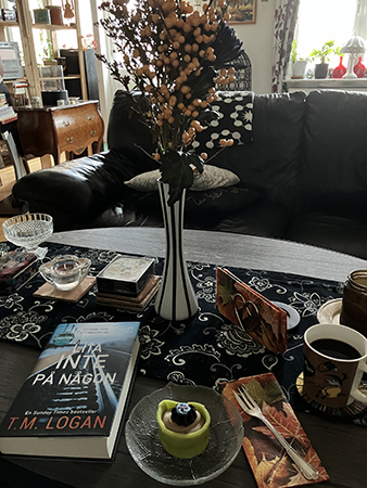 Eftermiddagsfika med Noisette blommor o boken Lita inte på någon
