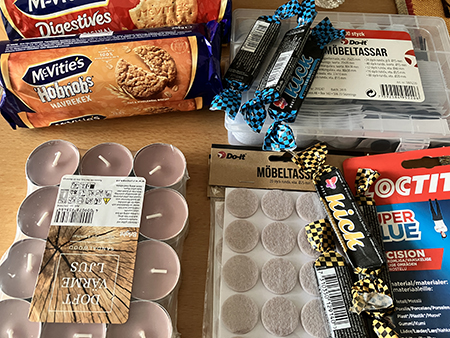 Möbeltassar, kex, Kick, värmeljus och superlim handlade jag på ett ställe…