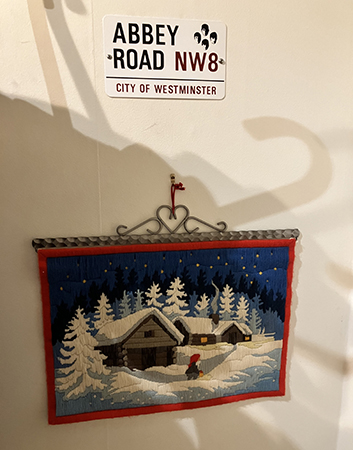 Garntomte och läsande tomteuggla på arkivskåpet i hallen