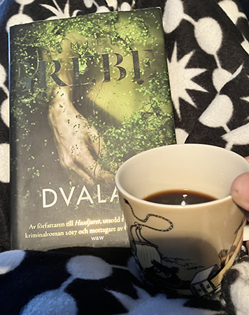 Boken Dvalan o kaffe i soffan med fleecefilt