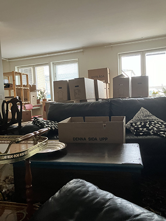 Flyttlådor i Salen fotade från köket