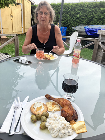 Fem äter lasagne o jag kyckling o potatissallad på trädäcket